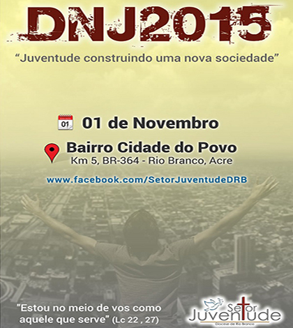 Com realização do Setor Juventude, o DNJ 2015 em Rio Branco será marcado pela união das diversas expressões juvenis ativas na Diocese, como Pastoral da Juventude, Ministério Jovem, Obra Shalom, Grupos independentes Católicos, Legião de Maria, Comunidade Novo Amanhecer e outros.