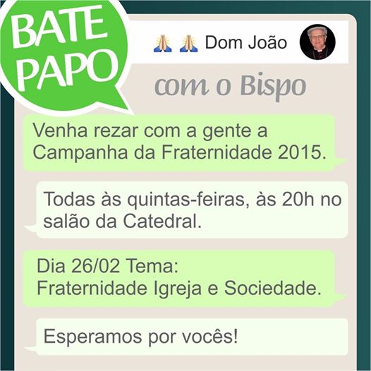 O Setor Juventude da Diocese de Anápolis promove durante todas as quintas-feiras da Quaresma, um bate papo com o bispo diocesano, Dom João Wilk. O encontro acontece no salão da Catedral do Senhor Bom Jesus e terá como tema, a Campanha da Fraternidade 2015, que tem como tema: “Igreja e Sociedade” e o lema “Eu vim para servir”.