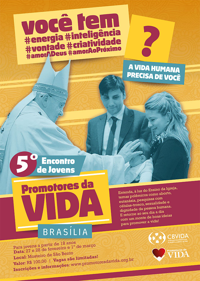 Se você tem mais de 18 anos e quer ajudar a promover a cultura da vida, já pode se inscrever para participar do V Encontro Jovens Promotores da Vida, que será realizado nos dias 27, 28 de fevereiro e 1º de março, no Mosteiro de São Bento, em Brasília.