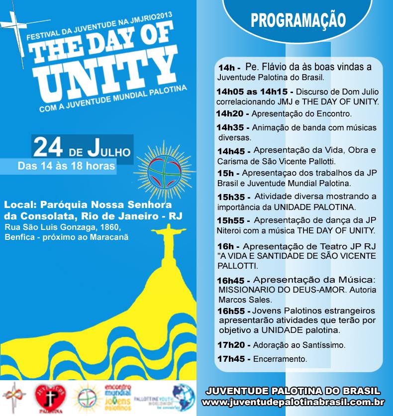 Uma dessas atividades que será proporcionada na JMJ-2013 será o “The Day Of Unity – O dia da Unidade”, no dia 24/07/13, na Paróquia Nossa Senhora da Consolata. Esta atividade será preparada pela Juventude Palotina do Brasil e Juventude Mundial Palotina, onde reunirá toda a Juventude Palotina, amigos, familiares e todas comunidade que esteja interessada em conhecer mais sobre nossas ativadades.