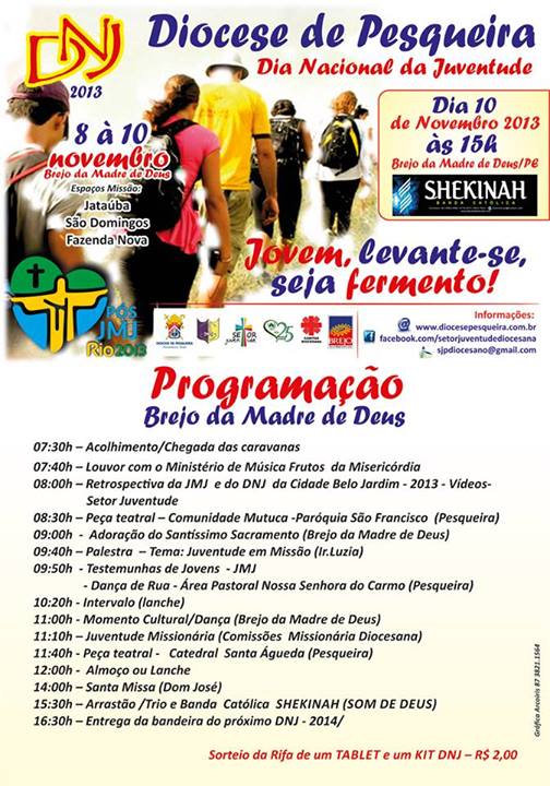 O Dia Nacional da Juventude 2013 de Brejo da Madre de Deus (PE), na diocese de Pesqueira, acontecerá no dia 10 de novembro. Confira a programação:
