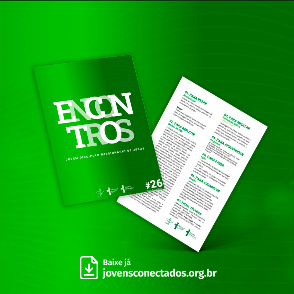 O Encontro #26 – Jovem discípulo missionário de Jesus convida os jovens a descobrirem que o verdadeiro sentido da vida nasce do encontro pessoal com Cristo e se concretiza no seguimento e na missão. À luz do Evangelho dos discípulos de Emaús Lc 24,13-35, o subsídio ajuda a compreender que quem caminha com Jesus, escuta sua Palavra e se deixa transformar por ela, torna-se testemunha viva do Evangelho no mundo, unindo fé, caridade e compromisso com os irmãos, especialmente os mais necessitados, a exemplo do testemunho de Carlo Acutis.
