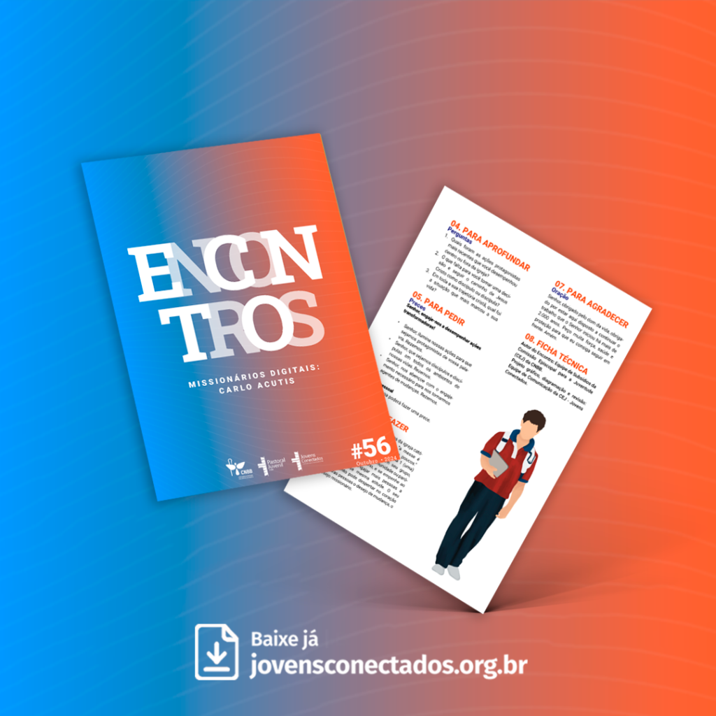 O Encontro #56 – Missionários digitais: Carlo Acutis convida os jovens a reconhecerem que a santidade também se vive no cotidiano e no ambiente digital. Inspirado no testemunho do Beato Carlo Acutis, que fez de Jesus o centro de seu projeto de vida, o subsídio ajuda a refletir sobre o protagonismo juvenil na missão, mostrando que as redes sociais, os estudos, o trabalho e os relacionamentos podem se tornar espaços de evangelização, testemunho e serviço, quando vividos com fé, coerência e amor a Cristo.