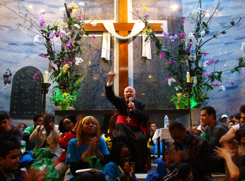 Alegre e bem humorado, o bispo de 80 anos contou histórias e chegou a entoar uma antiga canção de sua terra natal, o México. Ele aconselhou e desafiou os jovens a serem corajosos e ousados, alegres, sorridentes, a não se deixaram abater pelo pessimismo e a ambicionarem coisas nobres. Por fim, provocou-os: