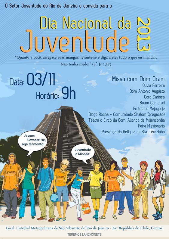 No domingo 3 de novembro, um grande evento movimentará a juventude carioca. A partir das 9 horas da manhã será realizado na Catedral Metropolitana de São Sebastião do Rio de Janeiro, localizada na Av. República do Chile – Centro, o Dia Nacional da Juventude (DNJ) 2013 que está em sua 28ª edição na cidade do Rio de Janeiro.