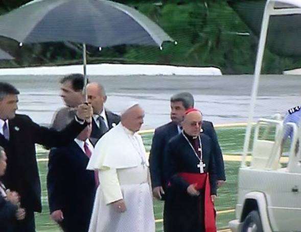 Papa Francisco chegou a Aparecida (SP) e foi recebido pelo cardeal Raymundo Damasceno Assis, presidente da CNBB e arcebispo de Aparecida. Na manhã desta quarta-feira, 24 de julho, deixando o Rio de Janeiro de avião, o Pontífice foi levado para o centro aeroespacial da cidade de São José dos Campos e de lá, de helicóptero, se transferiu para Aparecida. A missa que estava anteriormente programada para ser campal, vai ser celebrada dentro da Basílica Nacional.