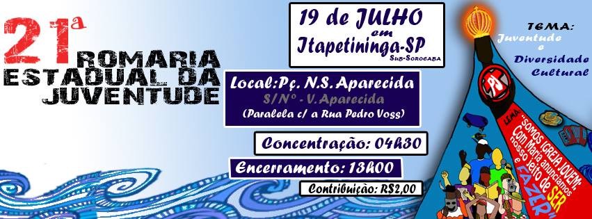 A Pastoral da Juventude do Regional Sul 1, que compreende o Estado de São Paulo, realiza no próximo domingo, 19 de julho, a 21ª Romaria Estadual, na cidade de Itapetininga. O tema norteador do encontro será “Juventude e Diversidade Cultural” e o lema “Somos igreja jovem: com Maria anunciamos nosso jeito de ser e fazer”.