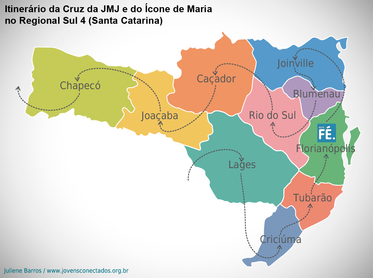 Em janeiro, será a vez de o estado de Santa Catarina, que corresponde ao Regional Sul 4 da CNBB, receber a Cruz dos Jovens e o Ícone de Maria, que já peregrinaram por quase todos os estados brasileiros. Todas as dez dioceses catarinenses receberão a visita dos símbolos, que começa no dia 1° e termina no dia 31 de janeiro. O principal momento da peregrinação no estado será o Bote Fé Florianópolis, no dia 12 de janeiro.