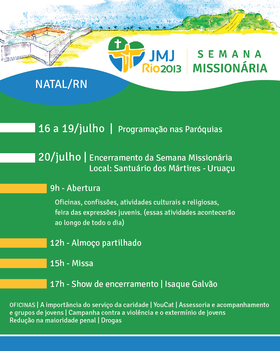 Várias paróquias da Arquidiocese de Natal realizam Semana Missionária, no período de 16 a 20 deste mês. A atividade antecede a Jornada Mundial da Juventude, que acontecerá no Rio de Janeiro, de 23 a 28.