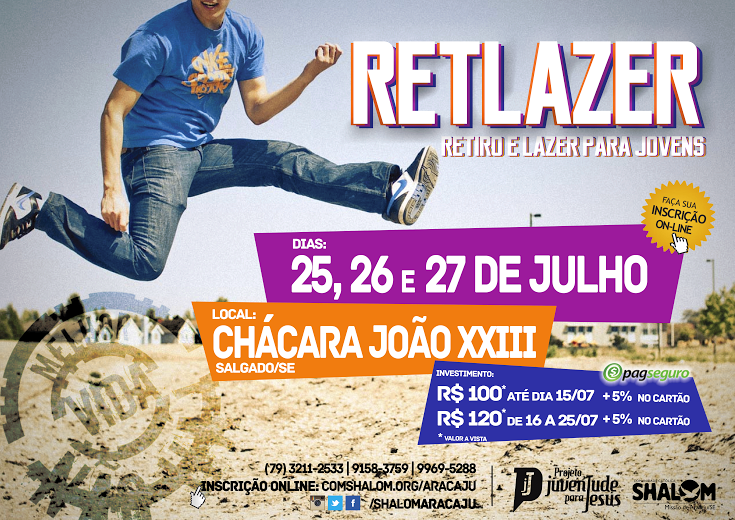 Mais que um Retiro e muito além de um Lazer, é a proposta do RETLAZER, que acontece em Julho de 2014, na Chácara João XXIII em Salgado/SE. De 25 a 27 de julho de 2014, o evento acontece na Chácara João XXIII, em Salgado (SE) e é promovido pelo Projeto Juventude para Jesus (PJJ), da Comunidade Católica Shalom de Aracaju, que tem como objetivo a evangelização e uma opção sadia de lazer para a juventude.