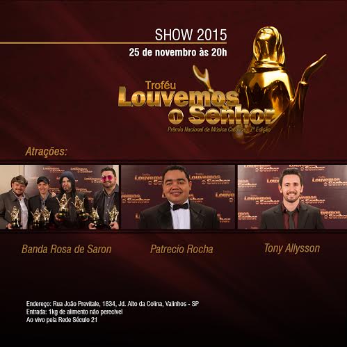 Dia 25 de novembro será realizado o “Show Troféu Louvemos o Senhor 2015”. Aberto ao público, e com transmissão ao vivo pela Rede Século 21, a partir das 20h, o evento reunirá artistas que foram destaques da 7ª Edição do maior Prêmio Nacional da Música Católica.